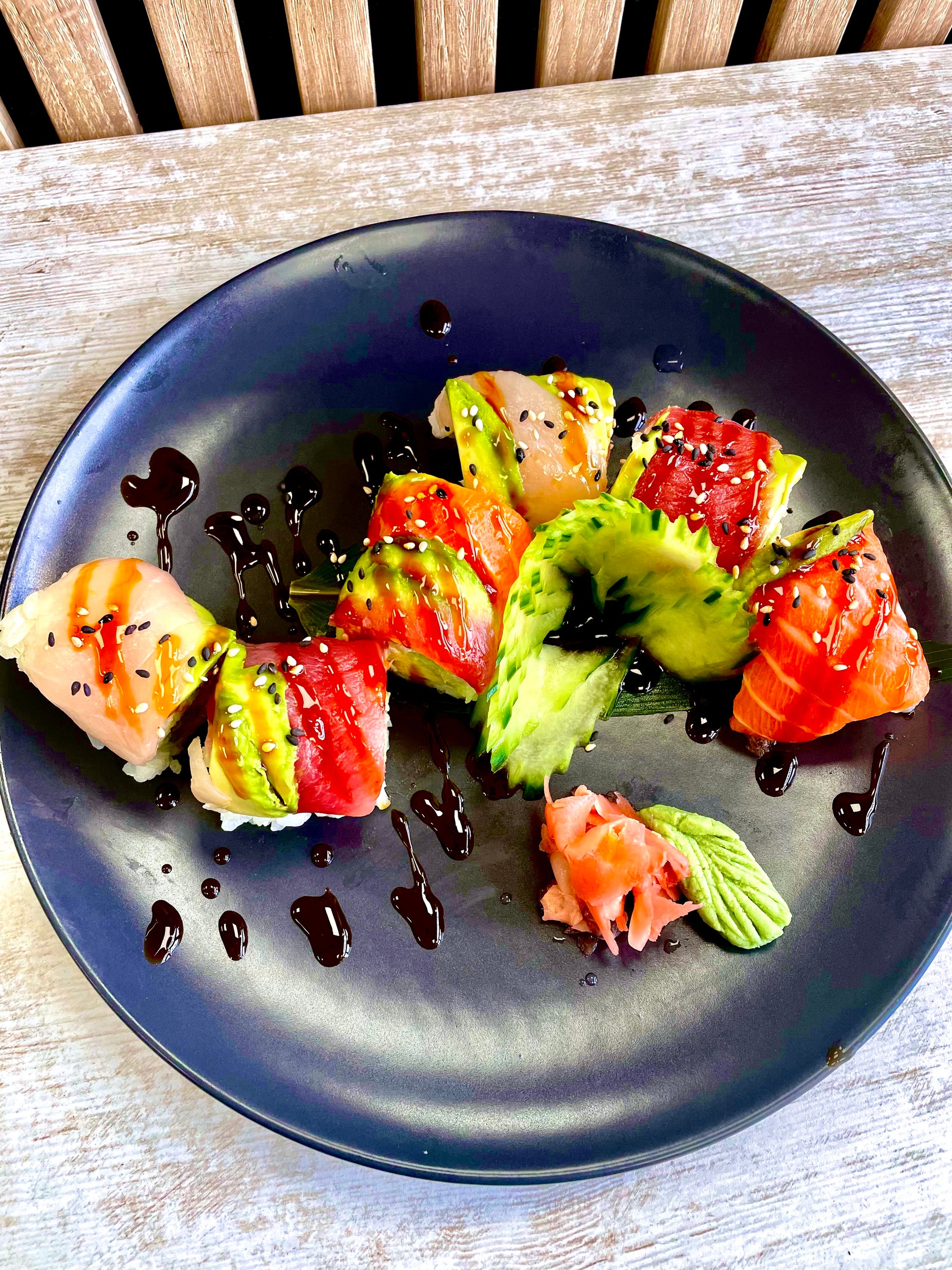 Savourez le Rainbow Roll d’O’sushis Riom : un california roll garni de fromage fondant à l’intérieur du riz vinaigré, et recouvert de fines tranches de saumon, thon et daurade. Un rouleau haut en couleur, mêlant fraîcheur, fondant et élégance pour une explosion de saveurs japonaises.